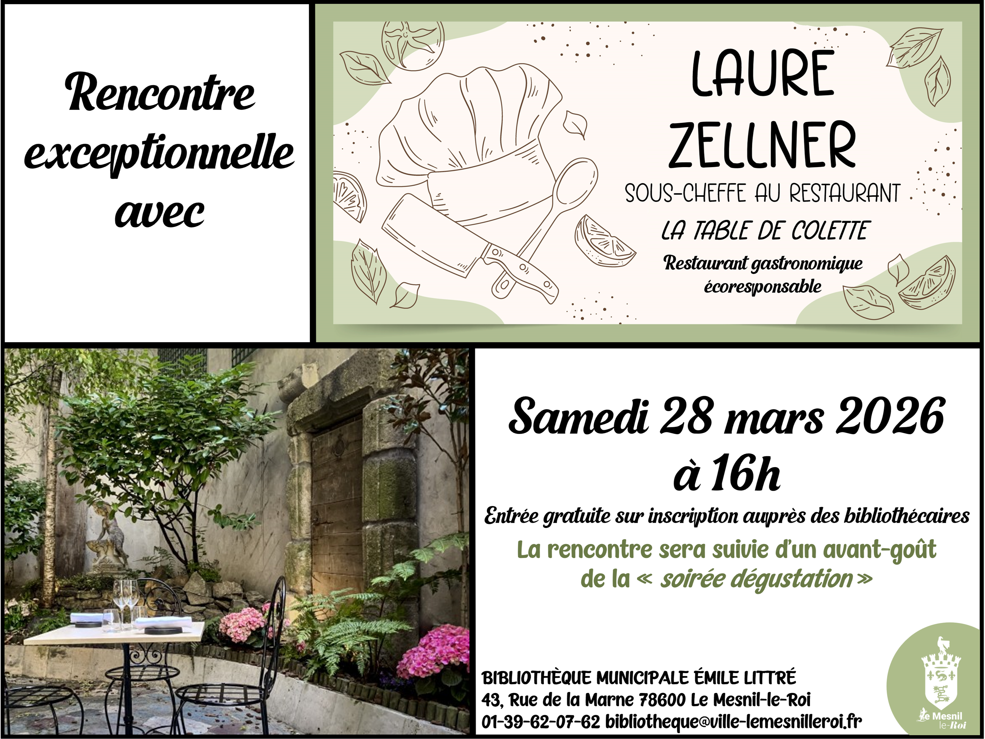 Bibliothèque du Mesnil-Le-Roi >> Actualités >> Rencontre exceptionnelle avec Laure ZELLNER Sous-cheffe au restaurant La Table de Colette samedi 28 mars à 16h